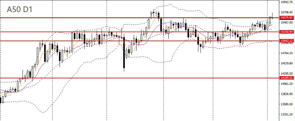 A50昨日再收长阳柱,刺破日线布林上轨,日线RSI位于50之上,4小时站上15500一线阻力,多单可继续持有,如彻底站上15700,短线可看多至16000。
