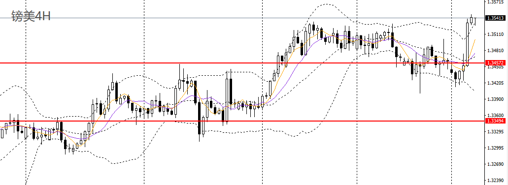 镑美昨日收看涨吞没阳柱,创3个月以来新高,4小时呈双底,且升破1.35关口阻力,如维稳于上方可维持低多思路,短线预计将重新回踩1.34。