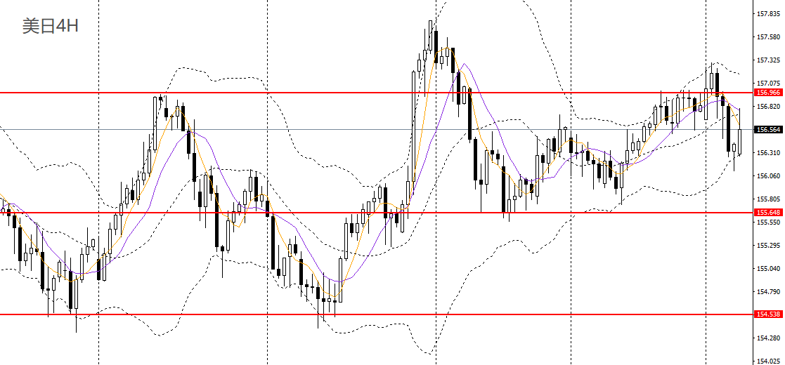 美日周一小幅收跌,5日、10日均线交错粘合,日线RSI位于50左右,4小时再度失守157关口,短线预计将维持155.70-157区间震荡走势,可保持观望。