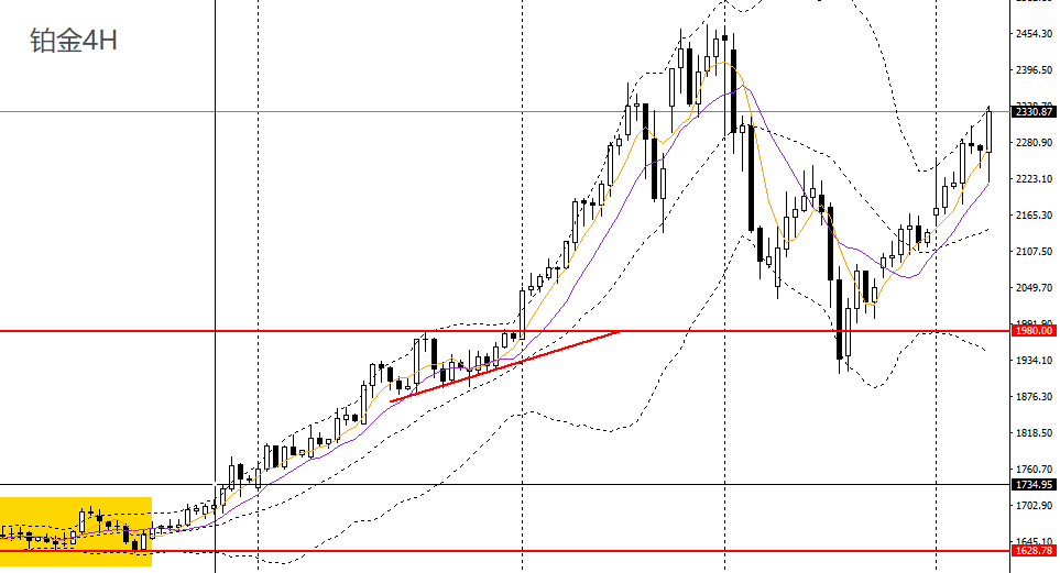 铂金周一大幅收涨,立于5日、10日均线上方,日线RSI继续走高,2200附近存在较强支撑,多单仍可持有,后市有望进一步上探2370。
