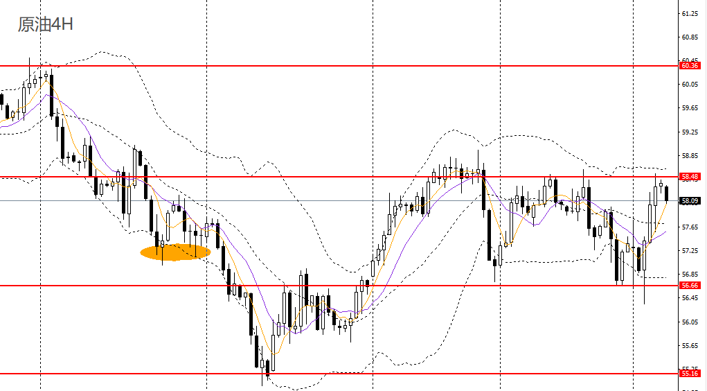 美原油昨日探底回升,4小时一度刺破56.50一线支撑,但最终守稳于上方,58.50一线仍面临强压,如未出现有效升破,可延续56.50-58.50区间内高抛低吸的操作。