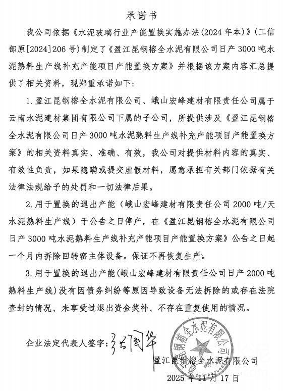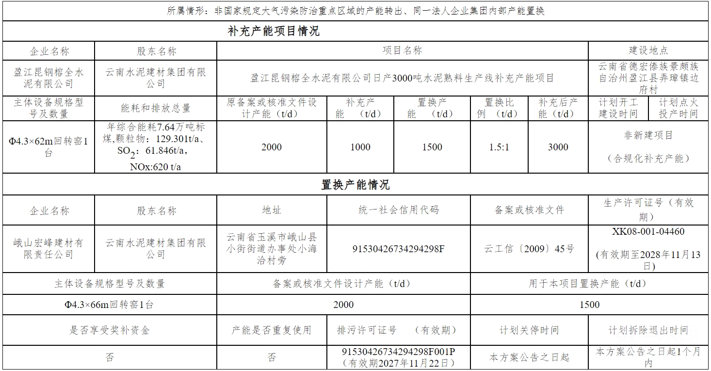 2026年1月6日, 云南省工业和信息化厅发布《盈江昆钢榕全水泥有限公司日产3000吨水泥熟料生产线补充产能项目产能置换方案公告》称,根据《工业和信息化部关于印发<水泥玻璃行业产能置换实施办法(2024年本)>的通知》(工信部原〔2024〕206号)和有关文件要求,云南省工业和信息化厅于2025年12月16日至12月29日对“盈江昆钢榕全水泥有限公司日产3000吨水泥熟料生产线补充产能项目产能置换方案”进行了公示,公示期间未收到异议,现予公告。