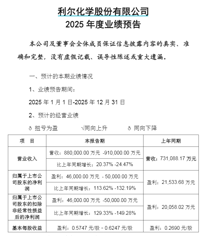 公告显示,2025年全年,利尔化学预计实现营业收入88亿至91亿元,同比增长20.37%至24.47%;归母净利润区间为4.6亿至5亿元,同比大幅增长113.62%至132.19%;扣非后归母净利润与归母净利润持平,同比增幅更高,达到129.33%至149.28%。同时,基本每股收益预计为0.5747元至0.6247元,较上年同期的0.2690元实现翻倍。