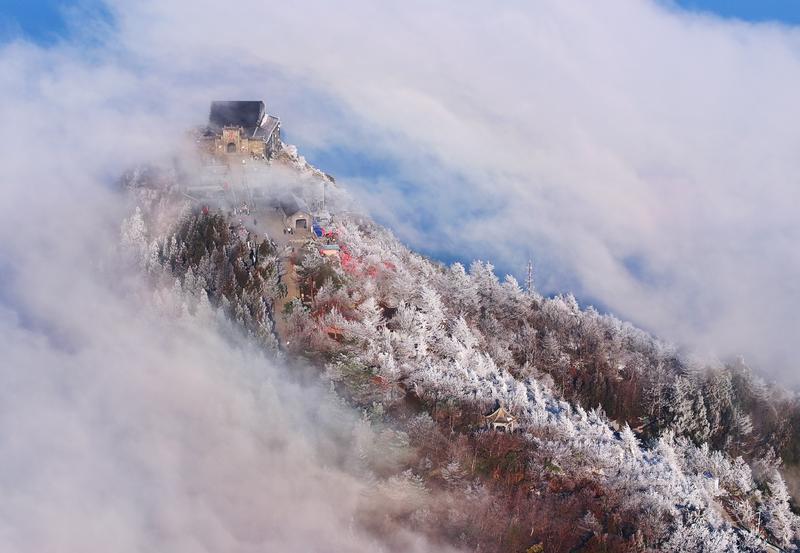 连日来,湖南省衡阳市南岳衡山风景区出现雾凇云海景观,壮美如画的景色吸引众多游客前来观赏游玩。