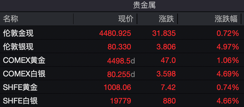 1月6日晚间,美股三大指数开盘均上涨。贵金属集体狂飙,现货白银升破80美元/盎司,日内涨近5%;现货黄金短线走高,突破4480美元/盎司;钯金、铂金也狂拉,截至发稿均涨超6%。