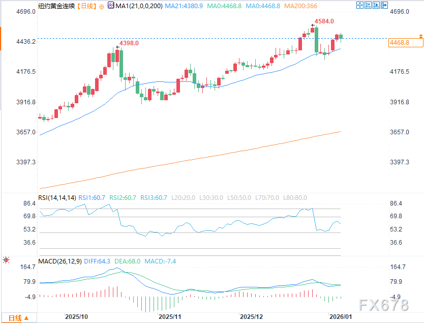 技术面来看,2月黄金期货多头的下一个上行目标是收盘价突破4584.00美元/盎司的合约高点/纪录高点这一强劲阻力位;空头的近期下行目标是推动期货价格跌破4200.00美元/盎司的强劲技术支撑位。第一阻力位见于隔夜高点4512.40美元/盎司,其次是4550.00美元/盎司;第一支撑位为今日低点4432.90美元/盎司,其次是4400.00美元/盎司。