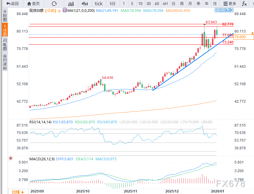 周三(1月7日)美盘时段,现货白银大幅走低,此前一度上涨至82.77美元,但未能触及83.94美元的历史最高点。随后的反转使市场重新回到78.70美元至77.05美元的关键回撤区间。正如我在周二的报告中所说,该区域正主导着市场的短期方向。