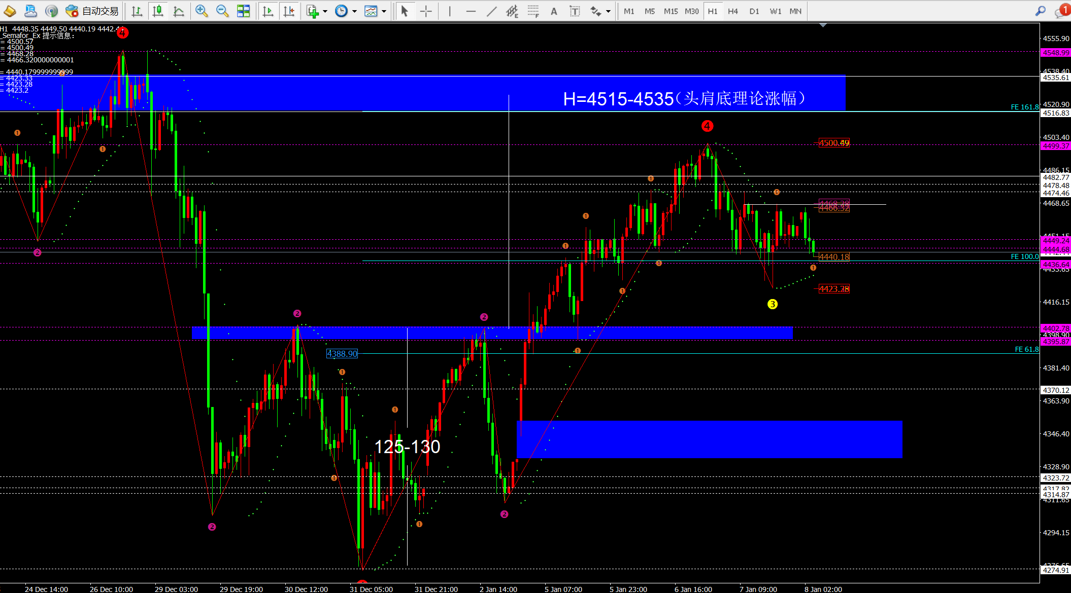 【2】 多单短期待定在4405-4412附近以及4380一线,二次空单在4489-92一线,防守4500,目标4470-4450-4430