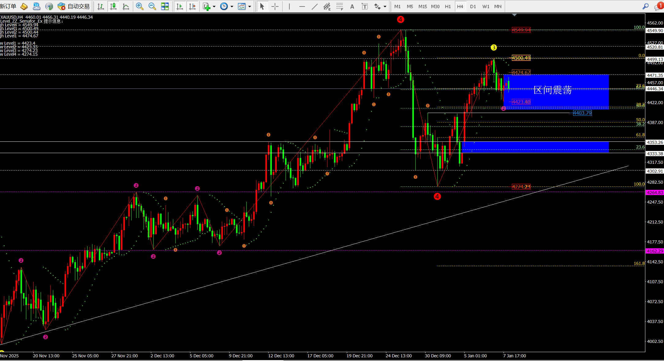 综合而言:日内关注昨日低点支撑,跌破价格会持续下跌试探4380一线;而4小时目前属于区间震荡,关注4429和4412一线的支撑,不过随着4小时11点收线均线MA60将上移4420一线,所以日内就关注昨日低点4423-27的支撑。