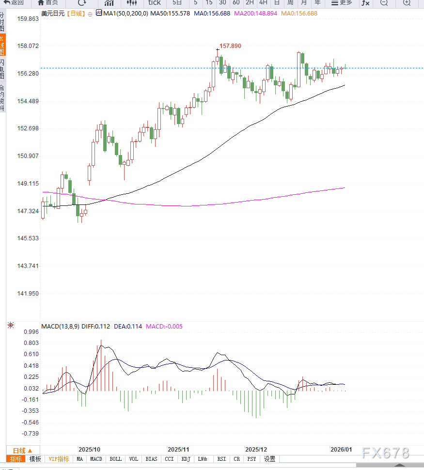 技术指标方面,RSI位于50上方但动能趋缓,表明多头优势仍在但不再强势。若汇价有效跌破156.20—156.30区域支撑,可能引发阶段性回调;反之,若重新站稳157并放量上行,短期仍存在测试前高的可能。