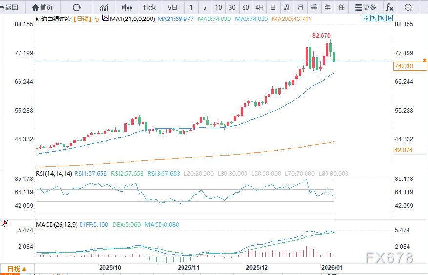 汇通财经APP讯——周四(1月8日)美国早盘交易中,黄金和白银价格走低,其中白银大幅下挫,主要受短线期货交易员获利了结及弱势多头平仓影响。白银市场形成看跌技术形态,令两种贵金属的多头投资者感到恐慌。此外,有一句古老的交易格言称,成熟的牛市需要持续注入新的利好消息才能维持。而目前这两种贵金属似乎正缺乏此类利好支撑。2月交割的黄金期货(一般高于现货金价十几美元)盘中报4431.7美元/盎司,下跌30.8美元;3月交割的白银期货报73.83美元/盎司,下跌3.783美元。