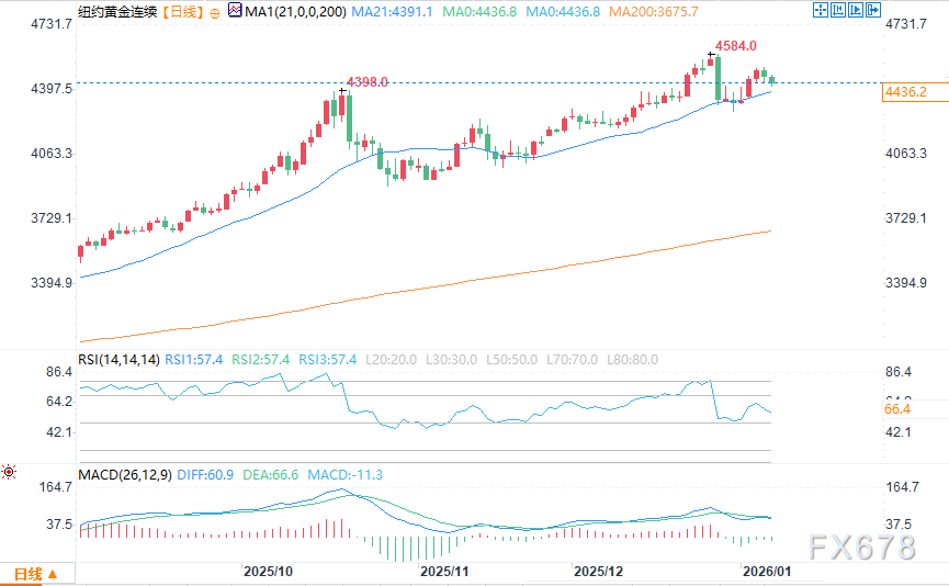 技术面分析:2月黄金期货多头的下一个上行价格目标是收盘价突破关键阻力位——合约历史高点4584.00美元/盎司;空头的近期下行价格目标是将期货价格推至关键技术支撑位4284.30美元/盎司下方。第一阻力位为隔夜高点4475.20美元/盎司,随后是4500.00美元/盎司;第一支撑位为4400.00美元/盎司,随后是本周低点4354.60美元/盎司。