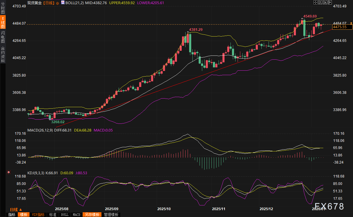 周四(1月8日),现货黄金在经历早盘下探后强劲反弹,最终收于每盎司4477.28美元附近,涨幅约0.5%。盘中一度触及4407.73美元的日内低点,这反映出市场在高位震荡中的谨慎情绪。尽管金价已站稳在4400美元上方,但短期内仍面临一定压力,主要来自于彭博商品指数的年度权重调整。这一调整机制旨在使指数更贴合市场现实,但在本周启动后,对黄金、白银等贵金属形成了明显的抛售压力。市场策略师指出,这种指数再平衡往往会引发基金被动卖出,导致金价短期承压,但这更多是技术性因素,而非基本面恶化。周五(1月9日)亚市早盘,现货黄金高位震荡,目前交投于4476.51美元/盎司。
