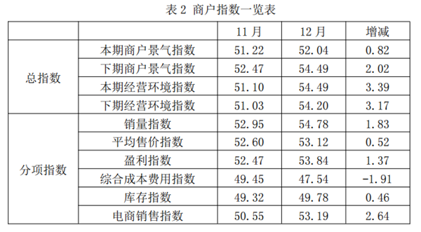 从商户景气指数来看,总指数中,12月商户景气指数为52.04,较上期上升0.82个百分点;经营环境指数为54.49,较上期上升3.39个百分点。