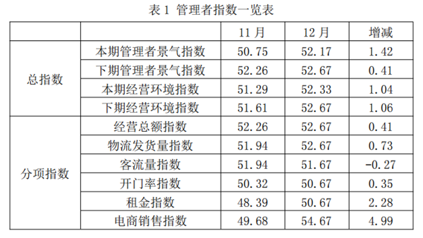从管理者景气指数来看,总指数中,12月管理者景气指数为52.17,较上期上升1.42个百分点;经营环境指数为52.33,较上期上升1.04个百分点。