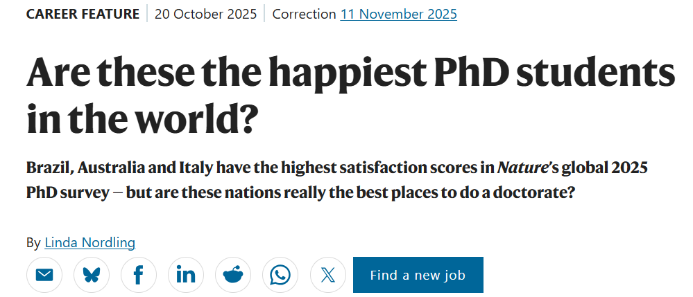 [1]NORDLING L. Are these the happiest PhD students in the world?[J]. Nature, 2025; 646(8086): 1013-1016. DOI: 10.1038/d41586-025-03346-4.