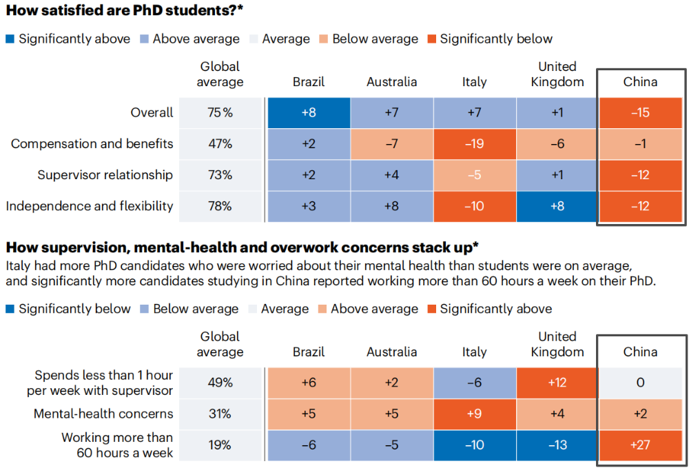 中国:整体满意度仅60%,较全球平均低15个百分点,多个核心维度表现不佳——导师关系、研究指导、旅行机会、科研独立性等满意度均低于平均;每周工作超60小时的比例达46%(全球平均19%),有受访者表示实际周工作时长甚至超80小时,远超“996”节奏;仅53%的学生“享受博士学习”、63%认为“工作有成就感”,均为全球最低。