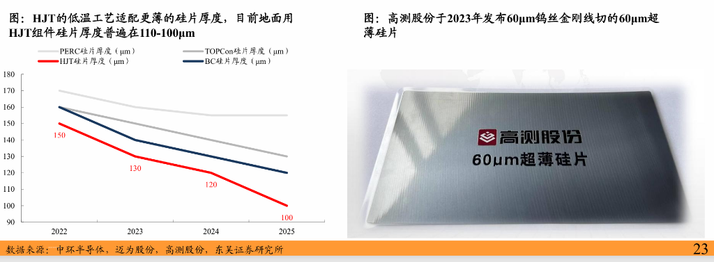 HJT可制备为 60μm/80–110μm等超薄硅片,显著降低重量并实现柔性设计;