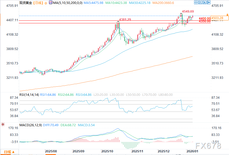 近年来,无论是发达经济体央行还是新兴市场央行,都在持续加大黄金储备的配置力度,这一趋势背后反映的是各国对全球经济不确定性、地缘政治风险以及主要储备货币信用风险的担忧,而央行的持续增持无疑为黄金价格提供了坚实的中长期支撑,也进一步强化了黄金的价值储存属性。汇通财经APP讯——在全球宏观经济环境持续复杂多变的背景下,黄金市场在过去一周再度展现出强劲的上涨韧性,价格波动重心稳步上移,目前正全力冲击并试图站稳4500美元关键整数关口。从当前市场多空博弈的态势来看,多头力量无疑占据了绝对主导地位,后续走势的核心悬念已转变为多头能否持续发力,成功突破关键阻力位并巩固上涨成果。
