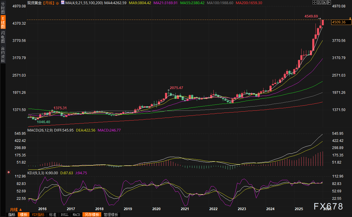 汇通财经APP讯——在2026年的第一个完整交易周,现货黄金价格再度上演惊心动魄的上涨行情,周涨幅接近4%,上周五(1月9日)收盘报4509.36美元/盎司,盘中最高一度触及4516.91美元,距离去年12月底创下的历史峰值4549.71美元已经非常接近,美国就业数据欠佳和地缘政治局势动荡,给金价提供了上涨动能。整个市场弥漫着一种难以抑制的兴奋情绪——黄金似乎正在为冲击5000美元大关积蓄最后的力量。