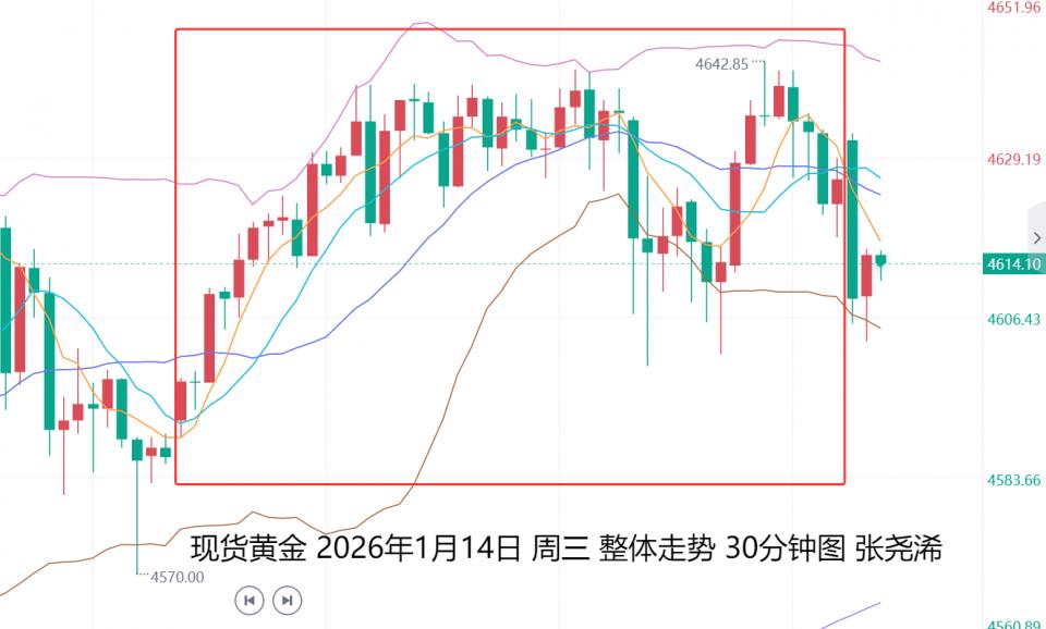 展望今日周四(1月15日):国际黄金亚市开盘,先行延续隔夜尾盘遇阻回撤之力表现走低,但更多的还是技术调整,虽然昨日零售销售数据及PPI等数据超预期,打压金价,但围绕美联储独立性的政治不确定性仍挥之不去,再加上地缘政治紧张局势持续提供支撑。再结合此前弱于预期的核心CPI数据,交易员仍维持对美联储年内两次降息的预期。故此,看涨前景因素仍然存在,一时的回撤,也仍然是再多的多头看涨机会。