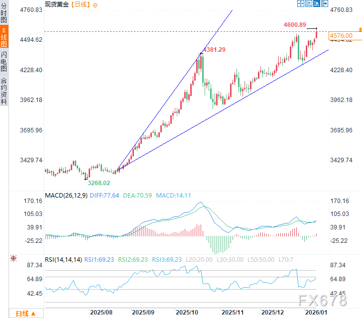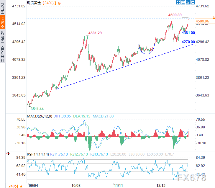 汇通财经APP讯——周一(1月12日)亚市时段,现货黄金震荡上涨,延续了前两个交易日涨势,一度触及4600.89美元/盎司的历史新高,日内涨幅约1.6%,现交投于4580美元/盎司附近。因地缘政治紧张局势加剧及市场对美国降息的预期,避险需求激增。弱于预期的美国就业报告进一步提振了贵金属的涨势。
