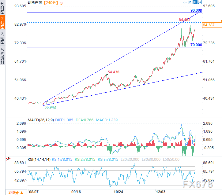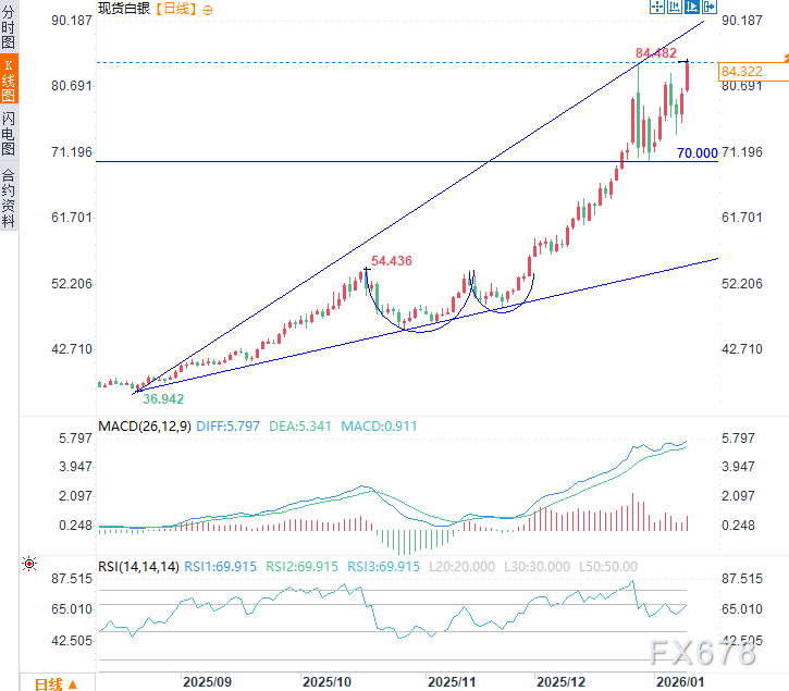 在上升扩散楔形内形成杯柄形态,是未来几天银价有望继续上行的积极信号。只要70美元的强劲支撑位保持有效,白银市场接下来的走势极可能将是上涨。