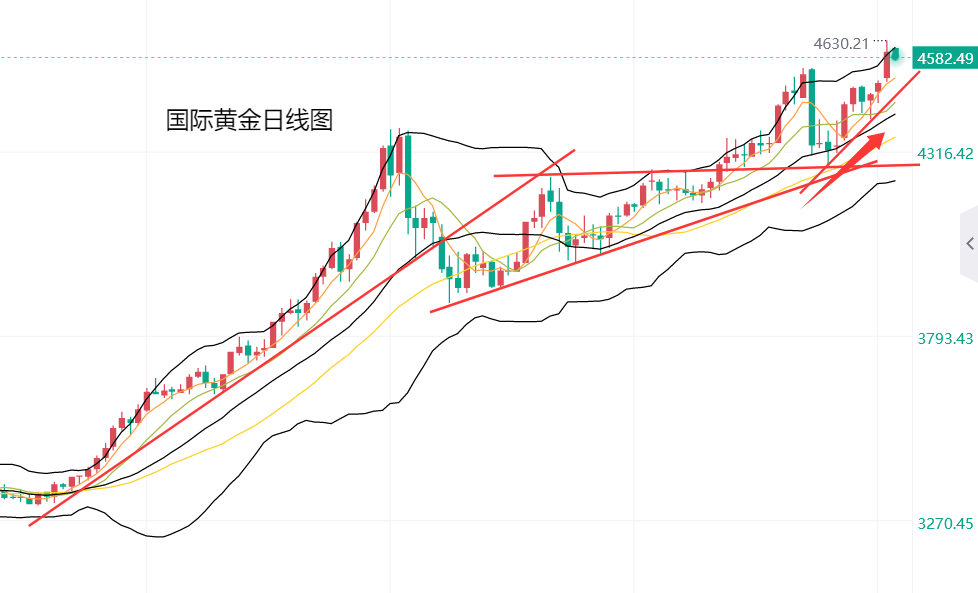 从之后的走势看,周一欧盘盘中,黄金再次试探4600美元整数位置遇阻后,回落4578美元企稳,美盘开盘后,黄金再次冲高,突破4600美元整数位置,刷新历史新高至4630美元,此后金价震荡回落,日内跌至4573美元企稳,目前交投于4583美元附近。总体来看,黄金周二突破4600美元整数位置,再创历史新高至4630美元,基本符合我们对金价有机会继续冲高的预期。