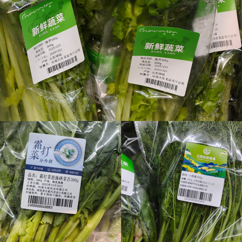 身为商务部认定的“农超对接”示范单位,大张的生鲜品类丰富度同样颇具竞争力。除了产地直采的各类叶菜,店内还引入云南分装的高原菜,以及由深圳市东源兴进出口有限公司供应的霜打菜等特色品类,满足消费者多元化需求。