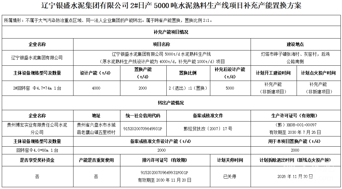 根据通告,辽宁银盛水泥集团有限公司5000t/d水泥熟料生产线原水泥熟料生产线设计产能为4000t/d,补充产能1000t/d,置换产能2000t/d,置换比例为2:1。贵州博宏实业有限责任公司水泥分公司一条2000t/d水泥熟料线用于本项目置换产能,该生产线目前已关停,计划2026年11月30日前拆除退出。