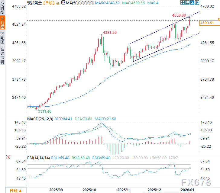 日线图显示,自11月形成的上升通道主导当前上涨趋势,阻力位于4650美元附近。50日简单移动平均线(SMA,4248.52)呈上行态势,凸显稳固的买盘基调,黄金持稳于该均线上方,保持看涨倾向。