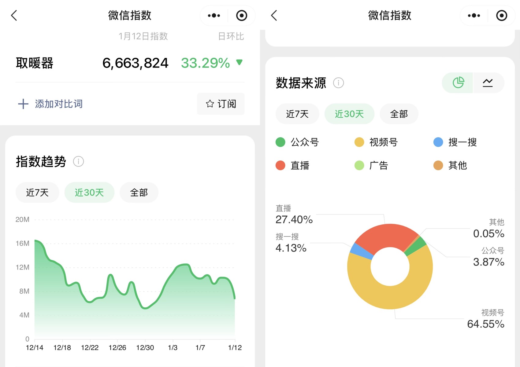 这种被“种草”的消费路径正逐步成为主流。微信指数显示,1月12日,“取暖器”关键词热度高达666万,其中视频号和直播带来的流量占比超过九成。相比过去到卖场比参数,年轻消费者更容易在短视频里被颜值、场景和演示“击中”。