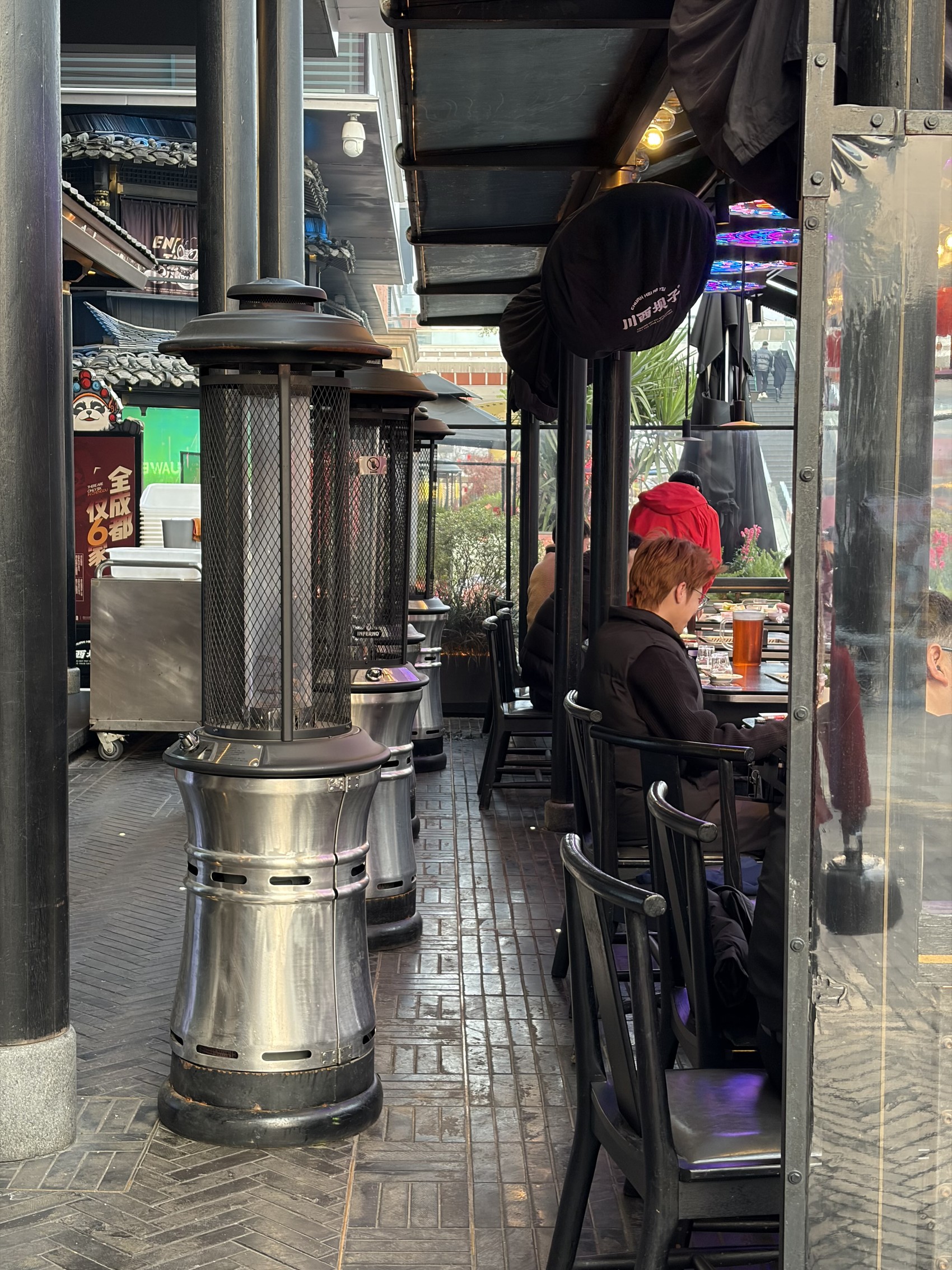 火锅店外摆区,取暖炉一字排开。