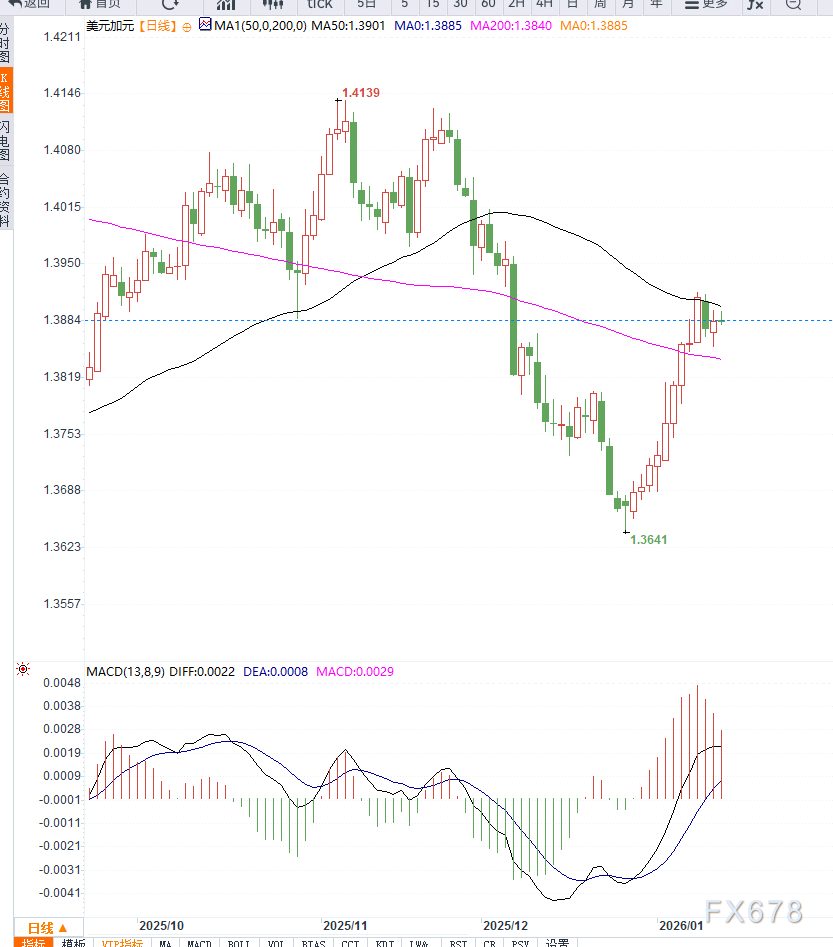 从日线结构来看,USD/CAD整体仍运行在上升通道内,汇价维持在主要均线系统之上,显示中期趋势偏多。近期价格回升并重新逼近1.3900关口,表明多头动能尚未完全消退。