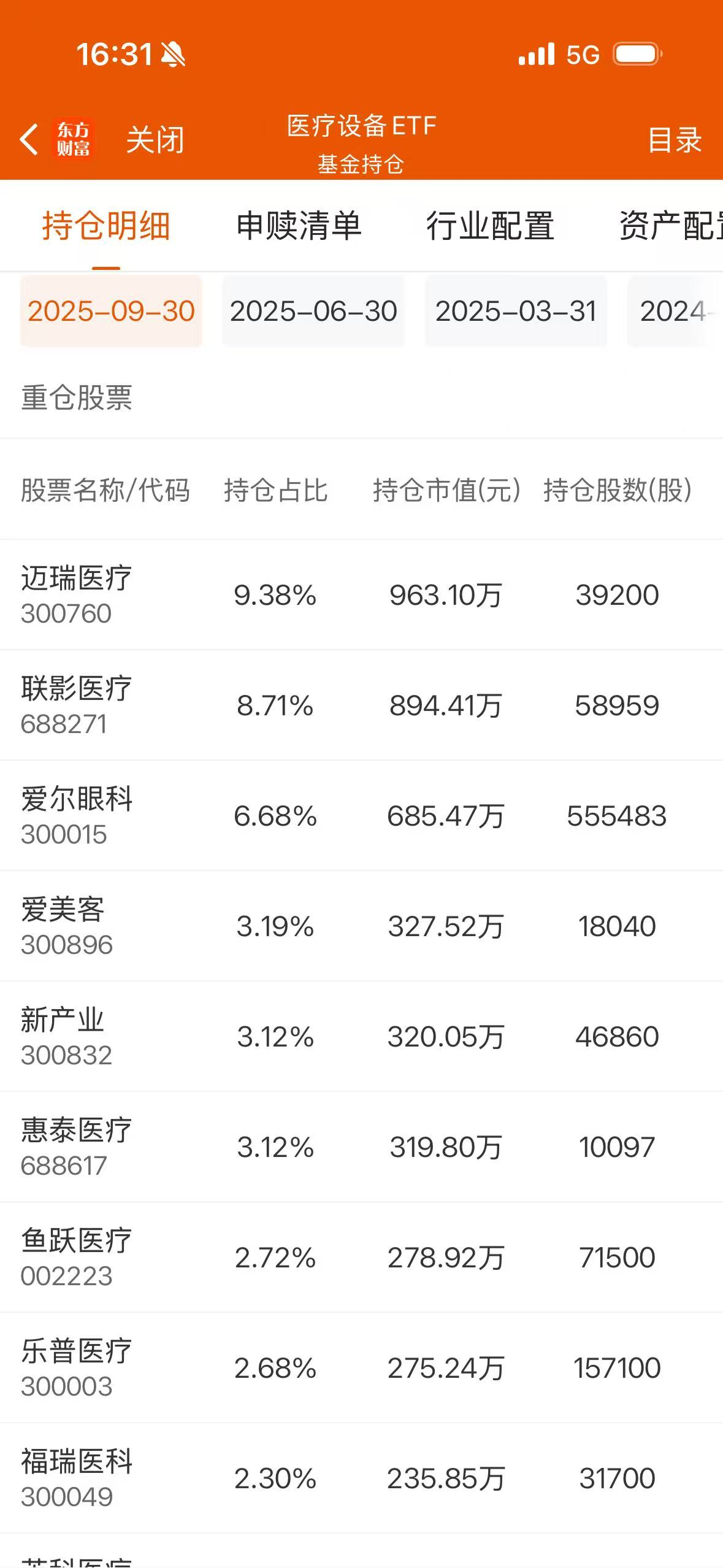 医疗器械ETF(562600),该基金跟踪中证全指医疗器械指数,成分股中脑机接口权重合计高达23.8%(同类最高)。同时,其医疗器械行业占比达89.2%,重仓股囊括迈瑞医疗、联影医疗、迪安诊断等行业龙头,精准捕捉细分赛道爆发红利。
