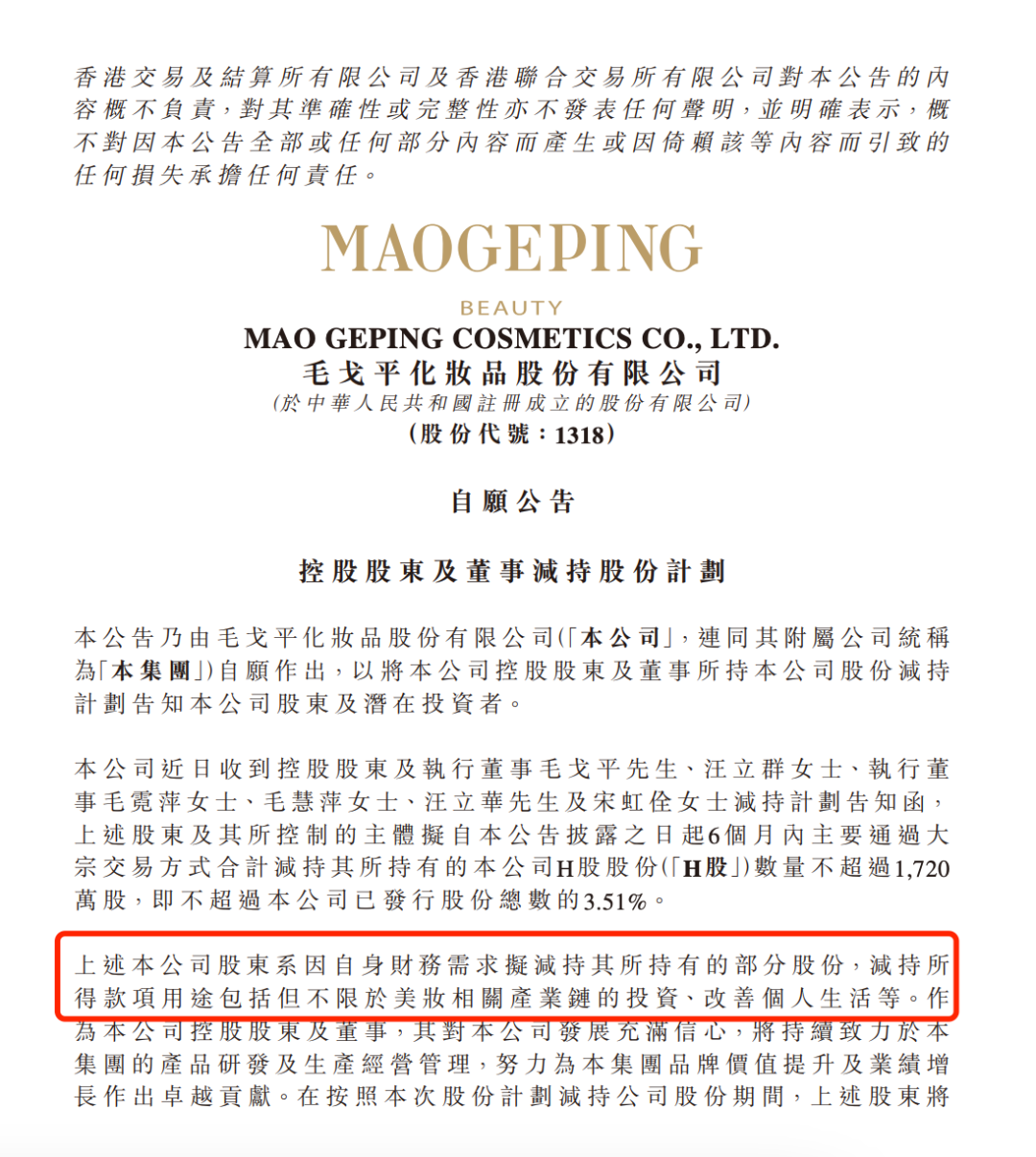 对于减持的原因,毛戈平的公告显示,上述董事因“自身财务需求”减持股票,所得款项将用于美妆相关产业链的投资、改善个人生活等用途。