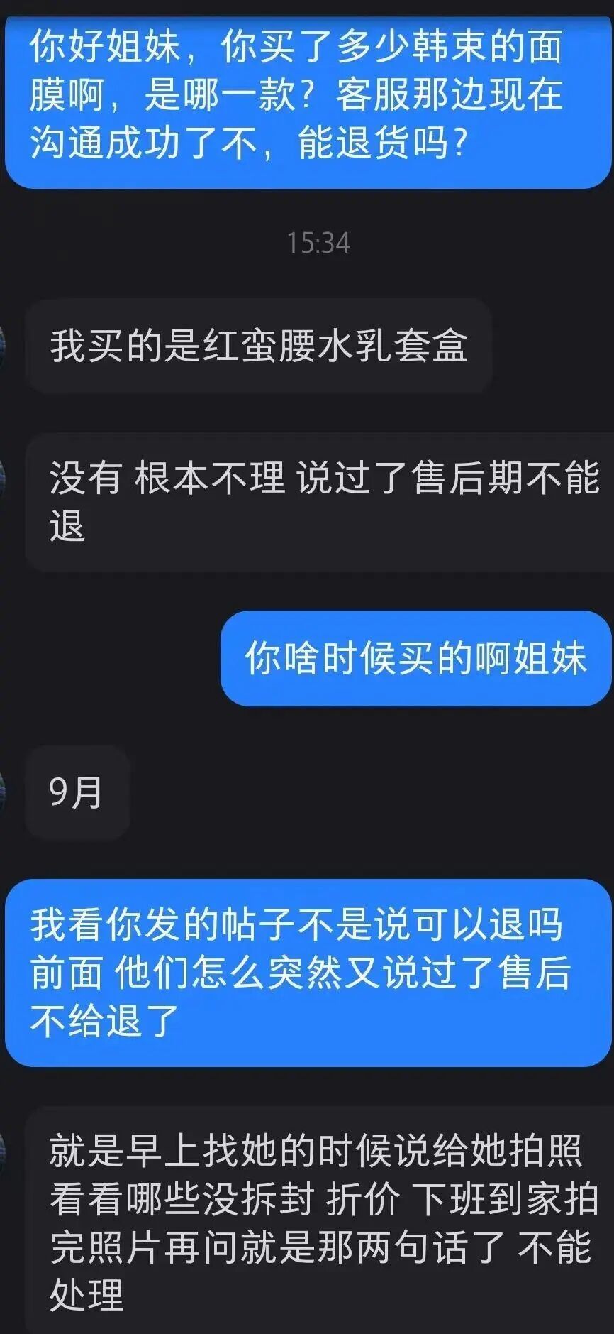 不少消费者吐槽,联系韩束客服退货时,得到的全是 “套路回复”:“超售后期,无法处理”“未拆封只能折价退”。