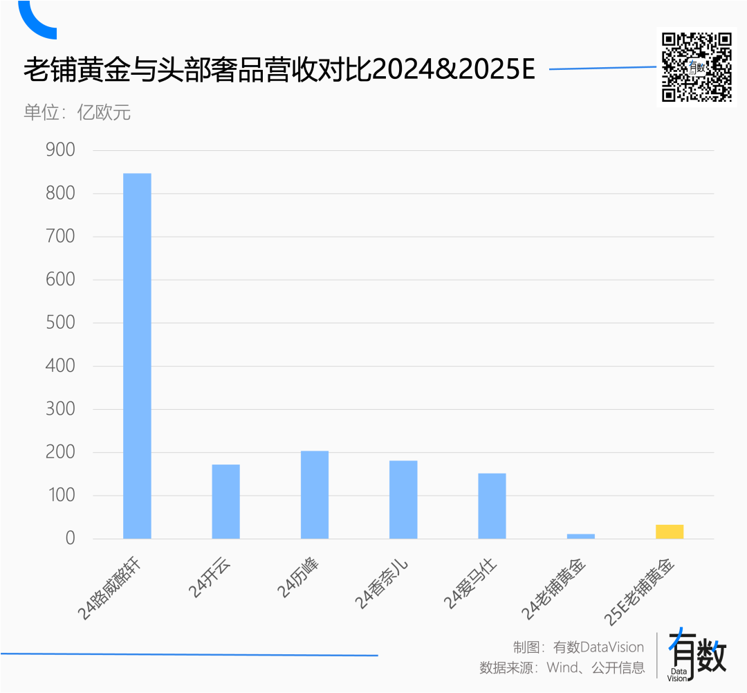 2024年(自然年),三大奢侈品集团和两大奢侈品品牌合计营收超过1500亿欧元(约合人民币12173.36亿元),约等于全球的奢侈品大盘。相比之下,老铺黄金2025年全年营收估计“只有”300亿港币(约合人民币268.37亿元)左右。