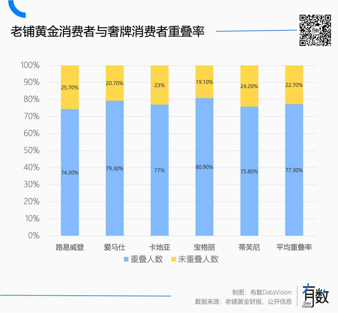按照弗若斯特沙利文的调研结果,老铺黄金的消费者与LV、爱马仕、卡地亚、宝格丽等奢侈品牌高度重合,平均重合率达到77.3%[2]。也就是说,买老铺黄金的和买卡地亚的,基本是同一批人。