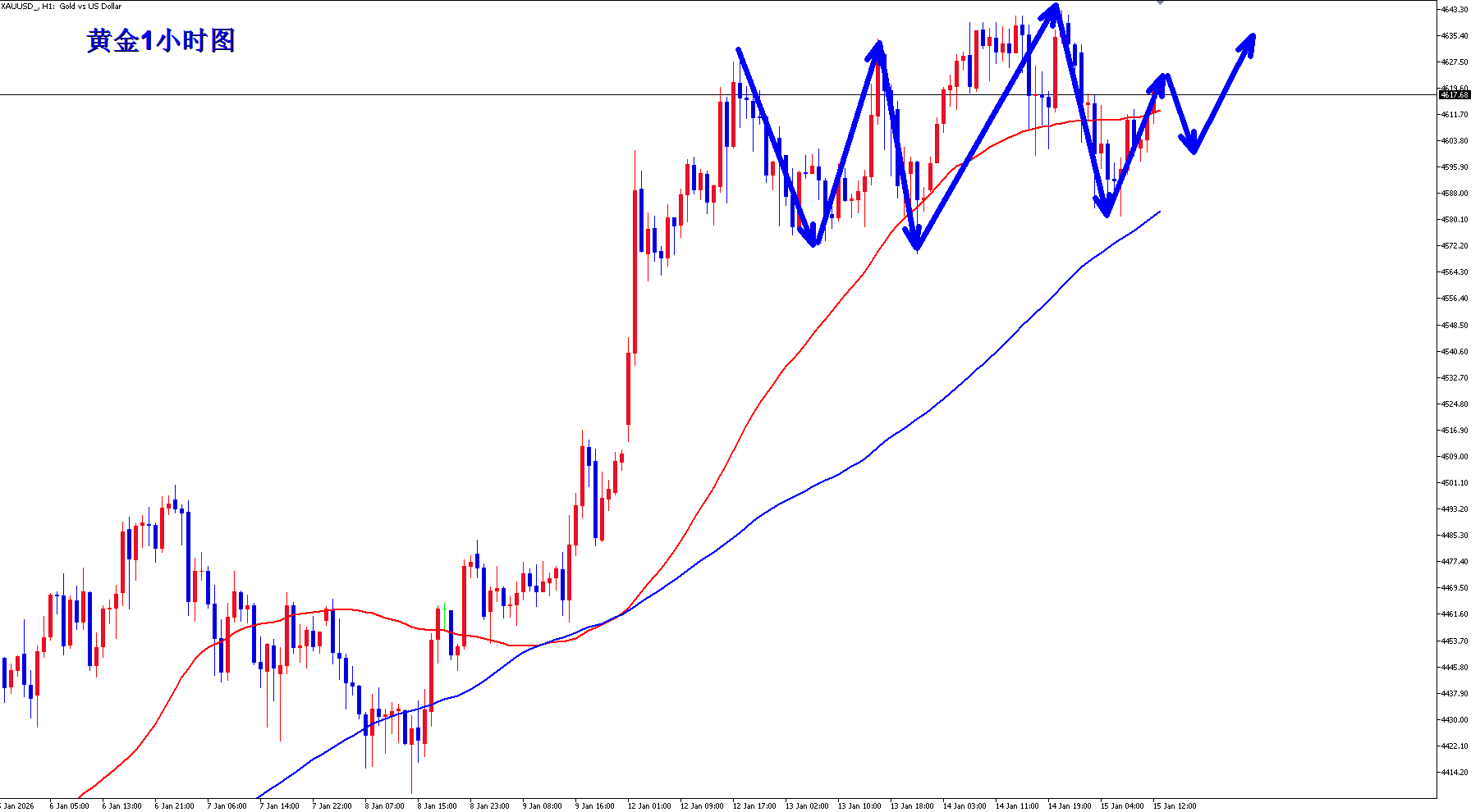 黄金1小时整体还是大区间震荡,下方4580一线还是有很强的承接能力,黄金美盘如果守住4580还是可以继续顺势多,不过黄金美盘首先可以关注4600附近支撑,如果4600附近获得支撑,那么短线也还是可以继续多,而且整体会更加偏强势,最终蓄势之后,有望再次向上突破新高。