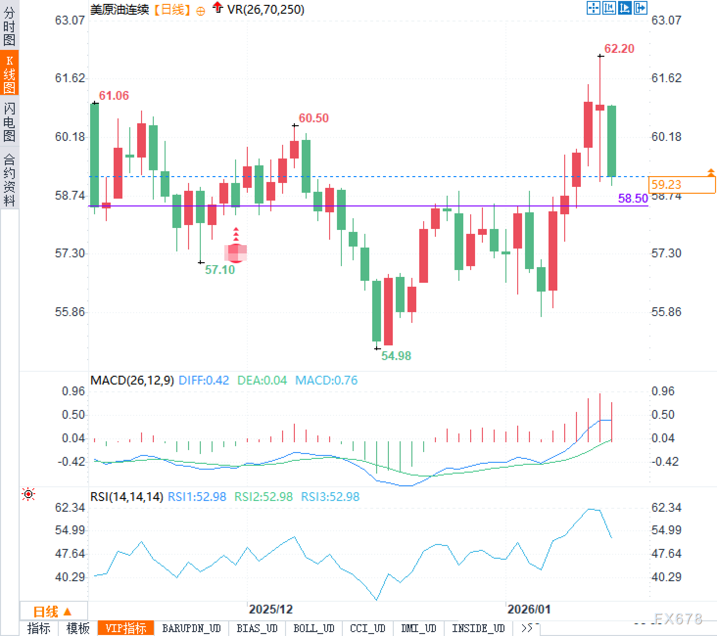 从技术图形看,美原油此前上冲至62.20美元后回落,目前59.23美元正处于前期密集成交区。下方58.50美元一带具备较强支撑意义,一旦跌破,可能引发进一步的技术性抛售;而上方需重新站稳60.20美元并尝试收复前高,才能重启升势。MACD指标显示DIFF为0.42、DEA为0.04、MACD柱为0.76,动能仍偏正面但趋于收敛;RSI(14)约为52.98,处于中性区域,表明市场已从“偏强”转入“均衡”状态,符合“溢价回吐后的震荡整理”特征。汇通财经APP讯——1月15日周四,国际原油市场迎来剧烈回调,价格出现显著回落。美原油最新报59.23美元/桶,较前一日高点快速下挫,盘中跌幅一度超过4.6%,布伦特原油也同步走弱,报63.70美元/桶,日内跌幅达2.8%。此前,油价曾因中东局势紧张而冲高至66.79美元/桶的阶段性高位,但随着地缘风险溢价迅速消退,市场进入“挤泡沫”阶段。