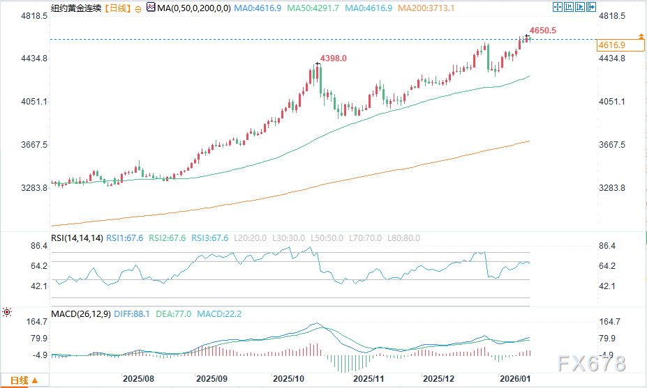 多头的下一个上行目标是推动期货价格收于4750.00美元的强劲阻力位上方;空头的近期下行目标是将期货价格跌破4400.00美元的坚实技术支撑位。第一阻力位见于周三创下的历史高点4650.50美元,其次是4675.00美元;第一支撑位为今日低点4584.50美元,其次是4550.00美元。