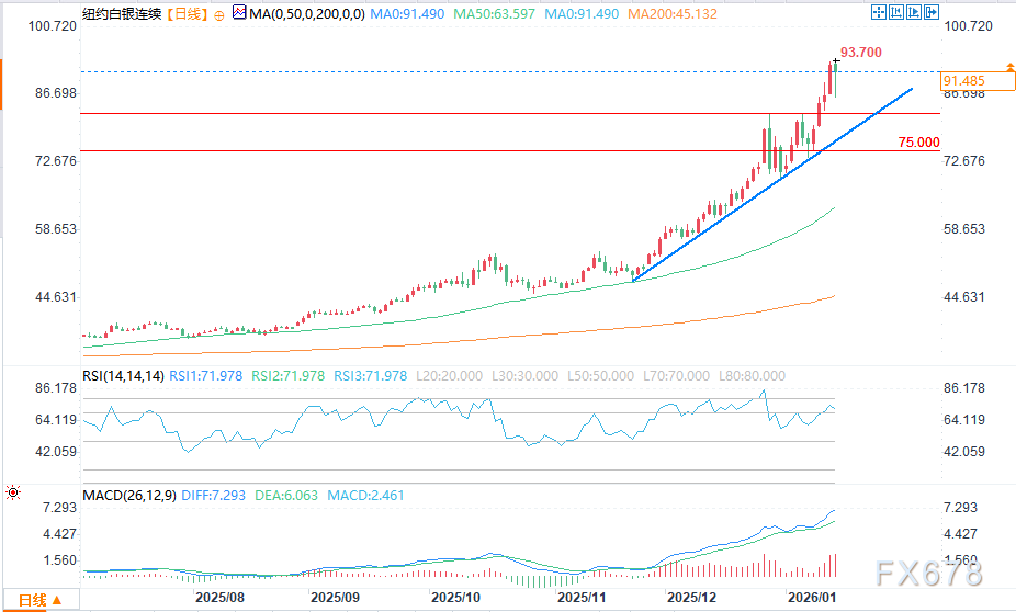 多头占据明显图表优势,下一个上行目标是推动期货价格收于100.00美元的强劲技术阻力位上方;空头的下一个下行目标是将期货价格跌破80.00美元的坚实支撑位。第一阻力位见于隔夜创下的历史高点93.70美元,其次是94.00美元;下一个支撑位为隔夜低点86.125美元,其次是85.00美元。