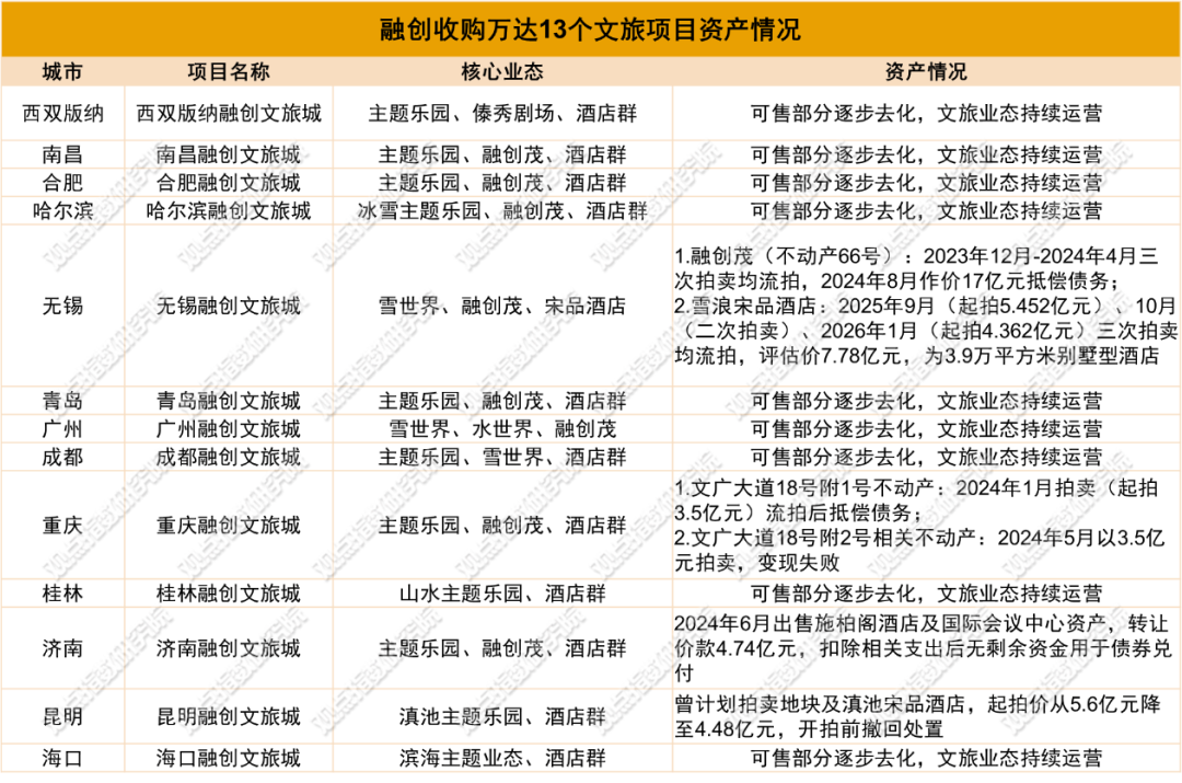 但梳理融创近年来的文旅资产处置情况可以发现,从万达收购的资产中,多个核心项目均遭遇变现难题,此次流拍的雪浪宋品酒店并非个例。