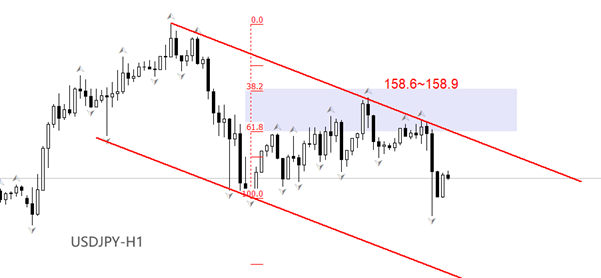 行情方面,小时周期,USDJPY处于短期回调态势。今日盘中(截至欧盘初)触及低点157.95点,有获得支撑迹象,下影线偏长。不过,市价距离通道线下轨仍有一段距离,仍存下跌可能性。考虑到前一轮反弹波段已经达到黄金分割区间158.6~158.9内部,所以本轮下跌走势触及通道下轨的概率相比获得支撑反弹的概率更高。