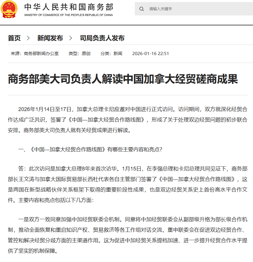 2026年1月14日至17日,加拿大总理卡尼应邀对中国进行正式访问。访问期间,双方就深化经贸合作达成广泛共识,签署了《中国—加拿大经贸合作路线图》,形成了关于处理双边经贸问题的初步联合安排。商务部美大司负责人就有关经贸成果进行解读。