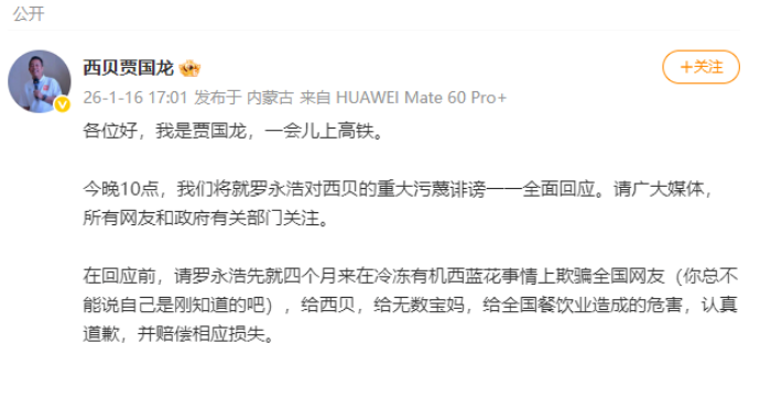 1月16日晚间,贾国龙启用久未更新的个人微博号宣布,在今晚10点将就罗永浩对西贝的重大污蔑诽谤一一全面回应。