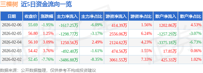 证券之星消息,截至2026年2月6日收盘,三棵树(603737)报收于55.69元,下跌1.95%,换手率0.64%,成交量4.69万手,成交额2.65亿元。