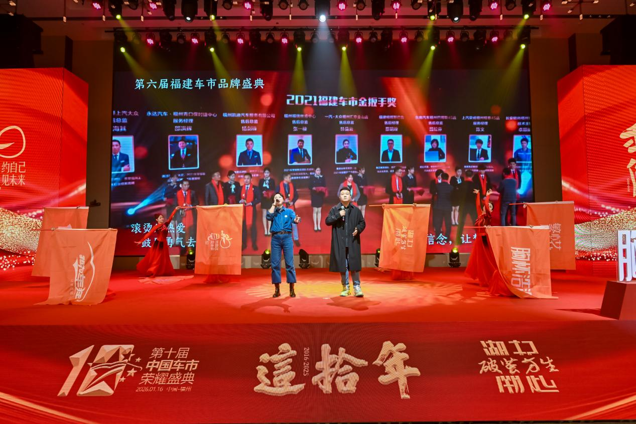 1 月 16 日,以 “潮起・破茧方生” 为主题的第十届中国车市荣耀盛典在福州举办。活动汇聚了汽车行业领袖、专家学者、车企高管及媒体精英,不仅回顾了中国汽车产业十年发展历程,还揭晓了涵盖车型、品牌、企业、经销商等类别的八十余项年度奖项,同期还举办了 “约见・这十年” 中国汽车人之夜活动。