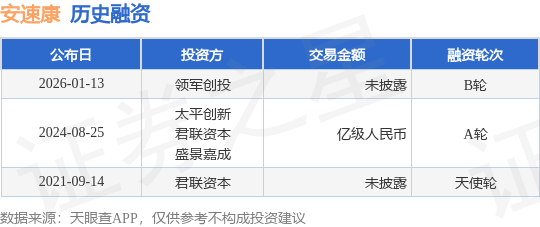 证券之星消息,根据天眼查APP于1月13日公布的信息整理,安速康医疗(苏州)有限公司B轮融资,融资额未披露,参与投资的机构包括领军创投。
